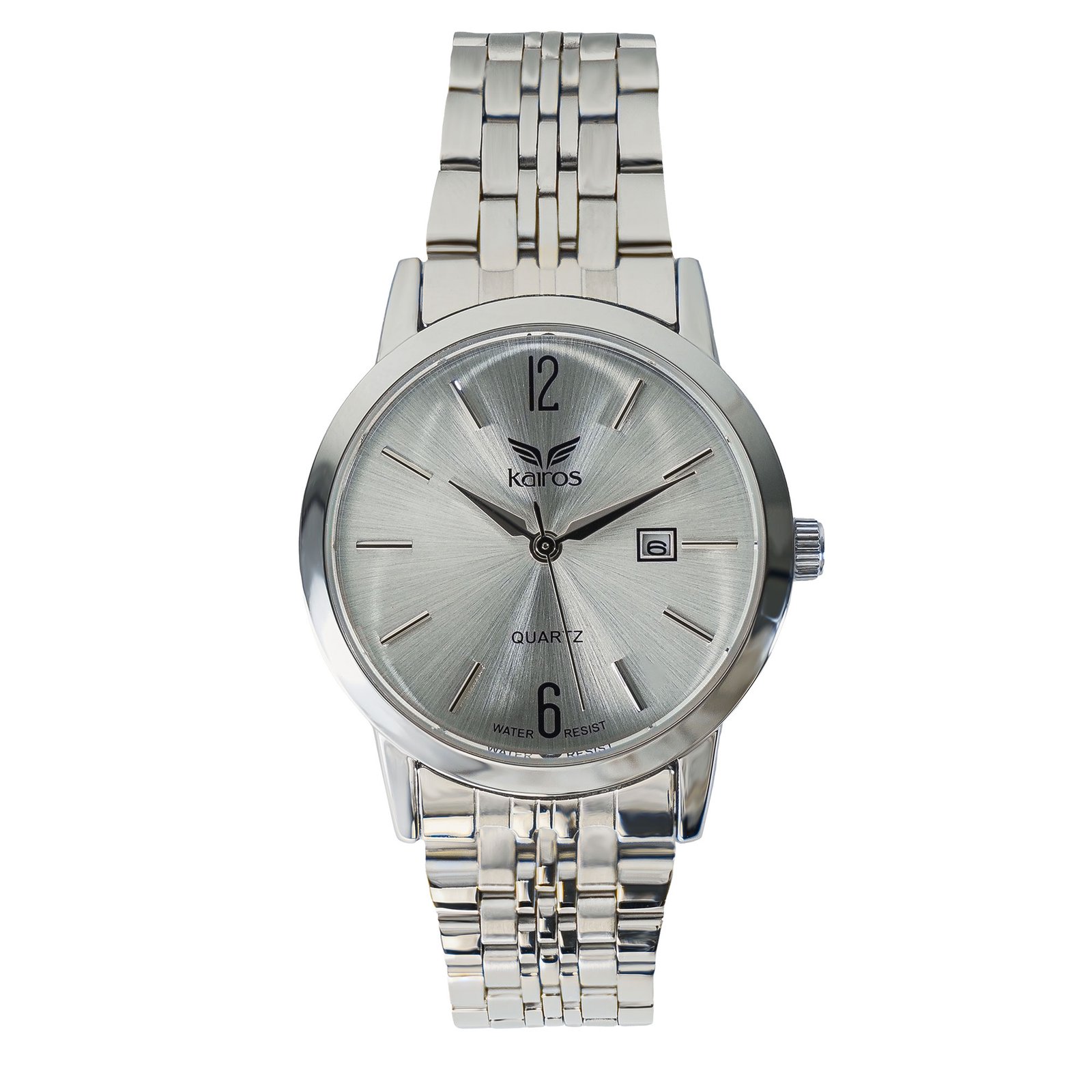 Reloj analógico diseñado con una estética clásica y elegante que combina acabados en tono plateado,con marcadores de hora minimalistas. Incluye números arábigos y una ventana de calendario, caja es metálica con un bisel plateado, complementada por un pulso de acero inoxidable bicolor de cinco eslabones, donde las filas centrales resaltan en color plateado.Funciona con un movimiento de cuarzo (Quartz), lo que asegura una medición del tiempo precisa y confiable, una resistencia al agua de 3 ATM, lo que los hace aptos para salpicaduras accidentales o el lavado de manos, pero no para sumergirse