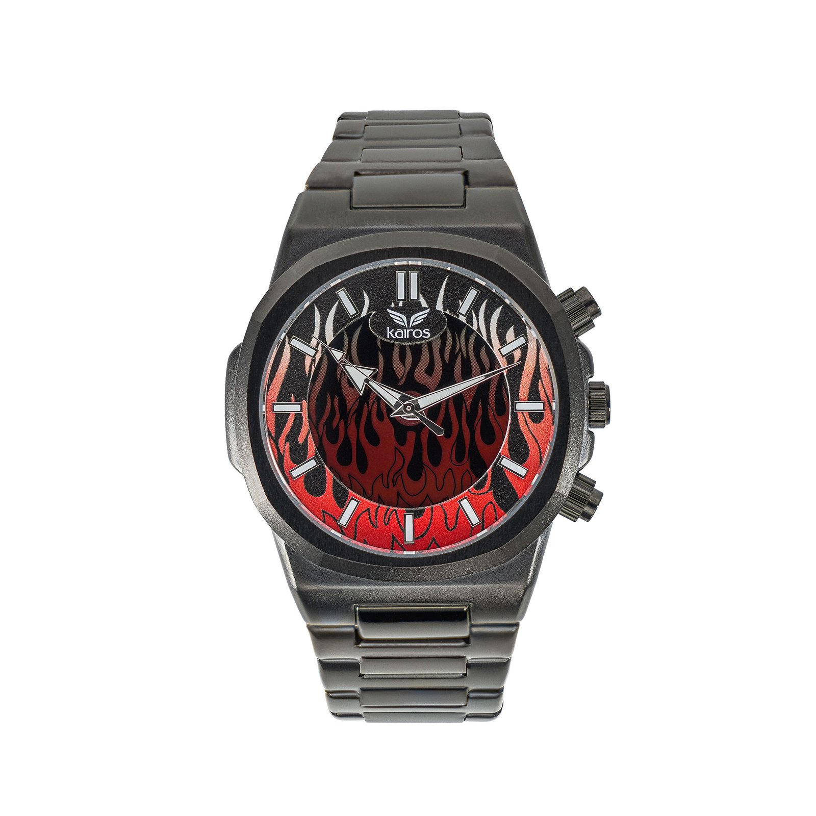 Se distingue por su diseño inspirado en la naturaleza y materiales únicos. A continuación, se detallan sus características principales, su esfera presenta una llamativa combinación de negro y rojo con una textura que evoca llamas o brasas, combina acero inoxidable con acabados en negro y detalles de madera, es un reloj de tipo cronógrafo, lo que significa que incluye subesferas para medir intervalos de tiempo, además de la indicación principal de la hora, cuenta con una resistencia de 3 ATM, lo que lo protege contra salpicaduras accidentales, lluvia o lavado de manos