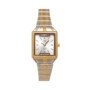 Reloj de acero inoxidable en acabado dorado, con tablero cuadrado fondo blanco que aporta un toque distintivo y sofisticado. Incorpora hora puntera . Ofrece resistencia al agua de 3 ATM, apto para salpicaduras pero no sumergible, y cuenta con un brazalete dorado , ajustable y cómodo, perfecto para uso diario o formal