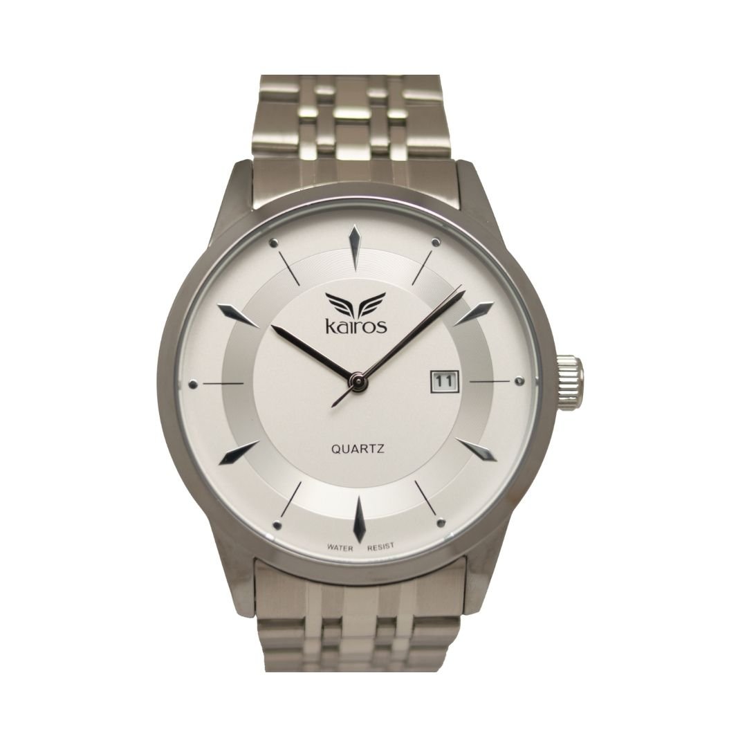 Reloj analógico de diseño elegante, con punteros clásicos y calendario integrado, ideal para un uso práctico diario. Ofrece resistencia al agua de 3 ATM, adecuada para salpicaduras. Su caja plateada y pulso en tono plateado le dan un estilo sofisticado y versátil.