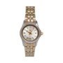 Reloj de acero inoxidable en combinación plateada y dorada, con diseño elegante y acabado brillante. Incorpora hora puntera y calendario integrado. Ofrece resistencia al agua de 3 ATM, apto para salpicaduras pero no sumergible, y cuenta con un brazalete bicolor ajustable y cómodo, perfecto para uso diario o formal.