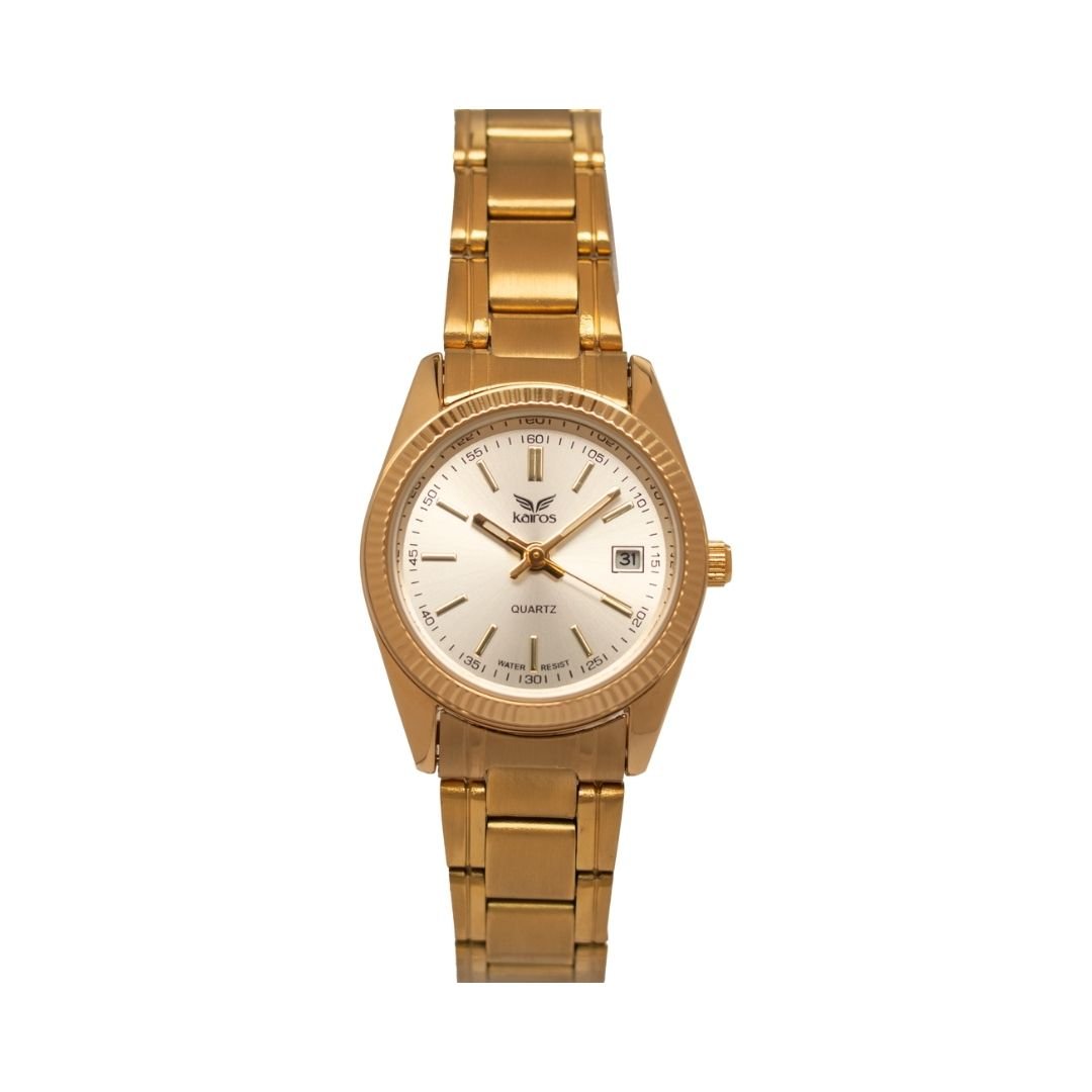 Reloj de acero inoxidable en acabado dorado, con tablero dorado que aporta un toque distintivo y sofisticado. Incorpora hora puntera y calendario integrado. Ofrece resistencia al agua de 3 ATM, apto para salpicaduras pero no sumergible, y cuenta con un brazalete dorado, ajustable y cómodo, perfecto para uso diario o formal