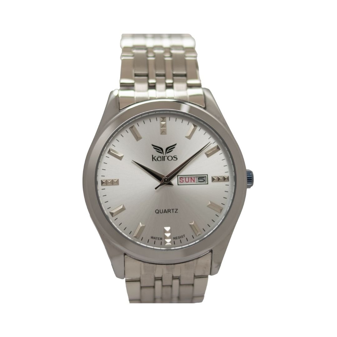 Reloj analógico de diseño elegante, con punteros clásicos y calendario integrado, ideal para un uso práctico diario. Ofrece resistencia al agua de 3 ATM, adecuada para salpicaduras. Su caja plateada y pulso en tono plateado le dan un estilo sofisticado y versátil.