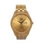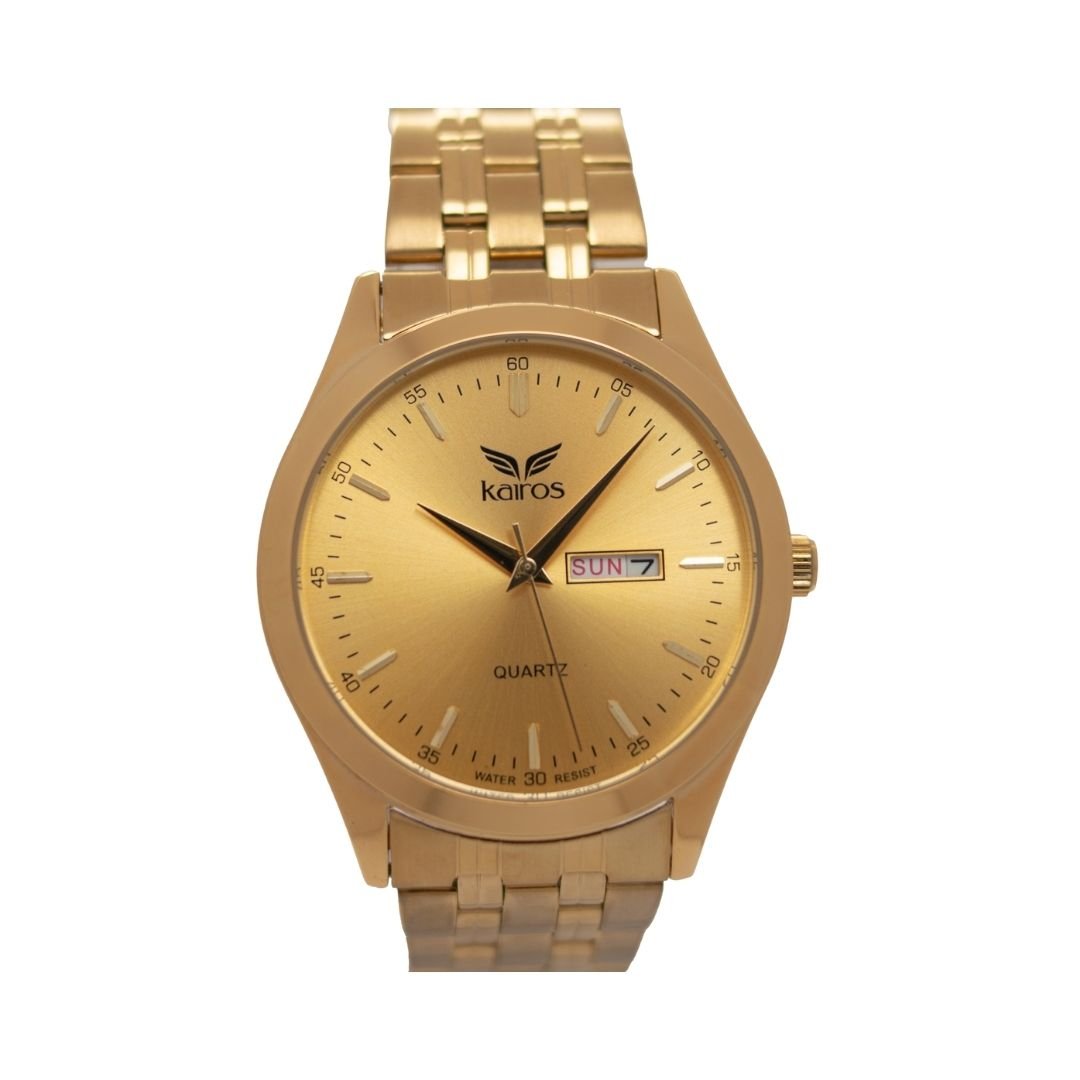 Reloj de acero inoxidable en acabado dorado, con diseño elegante y brillante. Incorpora hora puntera y calendario integrado. Ofrece resistencia al agua de 3 ATM, apto para salpicaduras pero no sumergible, y cuenta con un brazalete de color dorado ajustable y cómodo, perfecto para uso diario o formal.