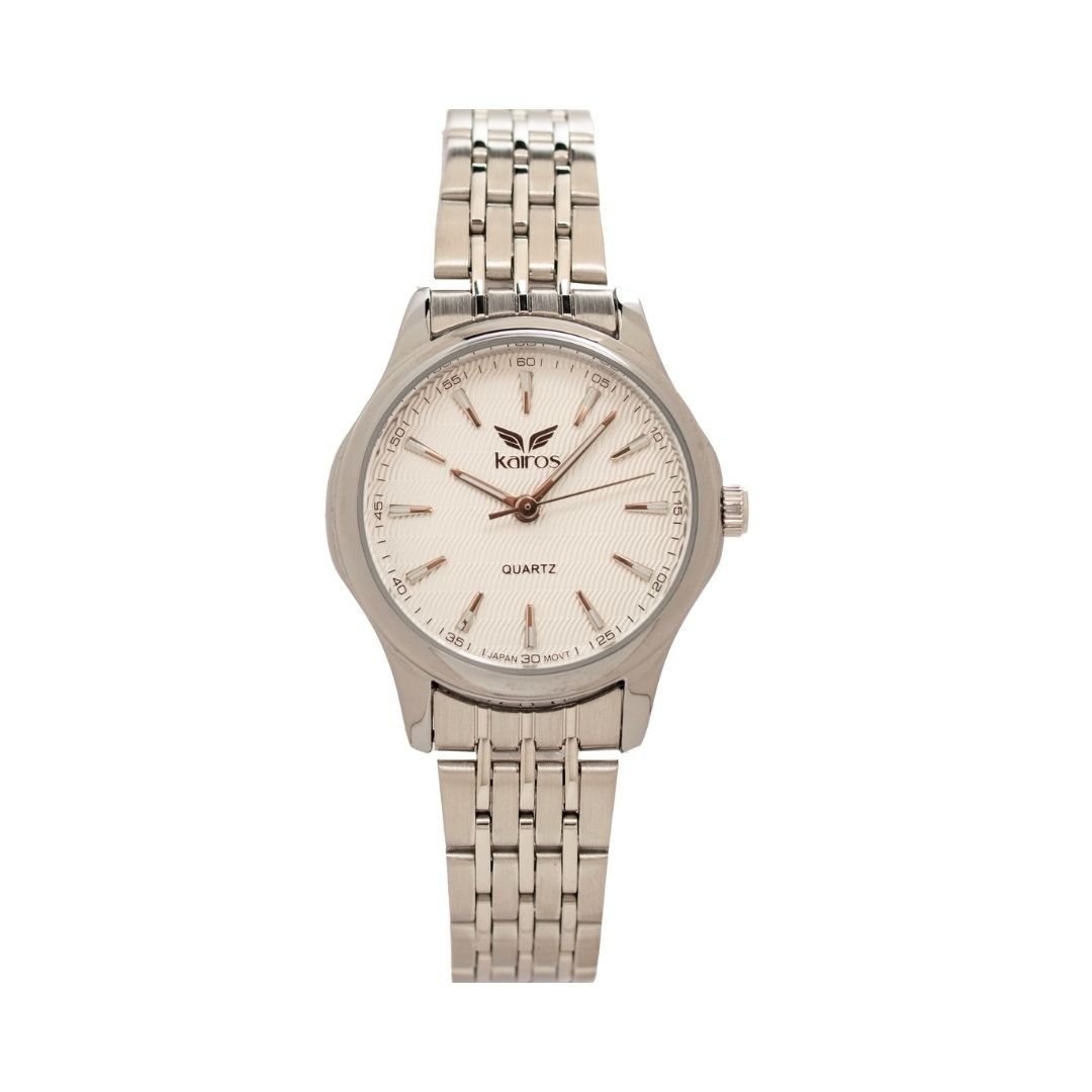 Reloj analógico de diseño elegante, con punteros clásicos. Cuenta con resistencia al agua de 3 ATM, ideal para soportar salpicaduras. Presenta caja plateada y pulso en tonos plateado, perfecto para un estilo sofisticado y versátil para el uso diario