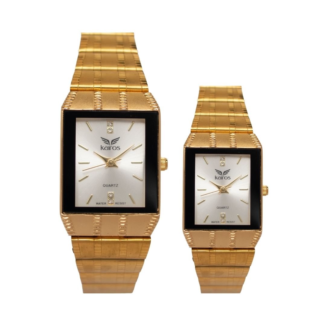 Hermoso par de relojes para pareja, diseñados para quienes desean compartir estilo y elegancia. Ambos relojes están fabricados en acero inoxidable color dorado, cuentan con hora análoga y calendario sencillo, ideales para el uso diario o para ocasiones especiales.
