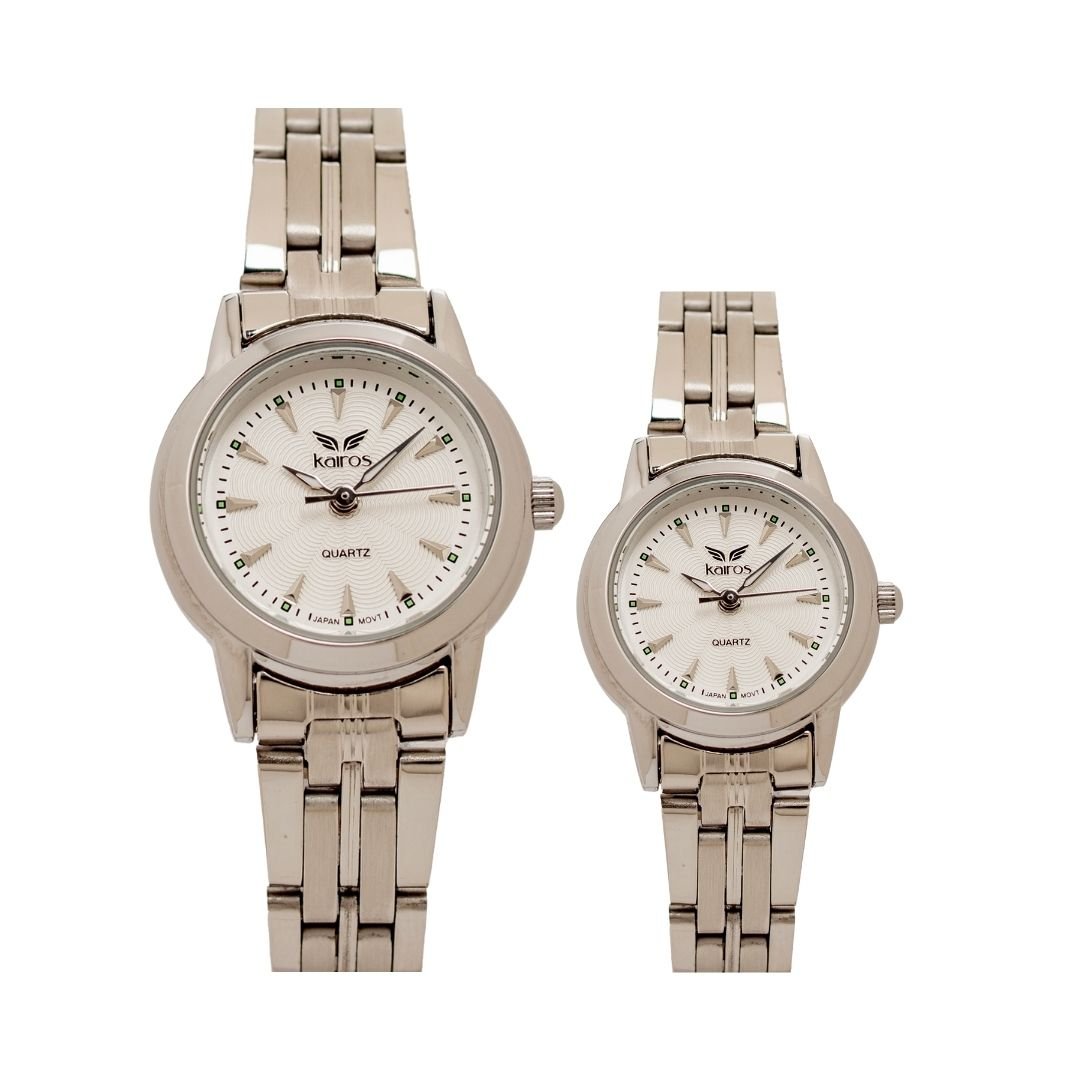 Hermoso par de relojes para pareja, diseñados para quienes desean compartir estilo y elegancia. Ambos relojes están fabricados en acero inoxidable color plateado, cuentan con hora análoga y calendario sencillo, ideales para el uso diario o para ocasiones especiales.