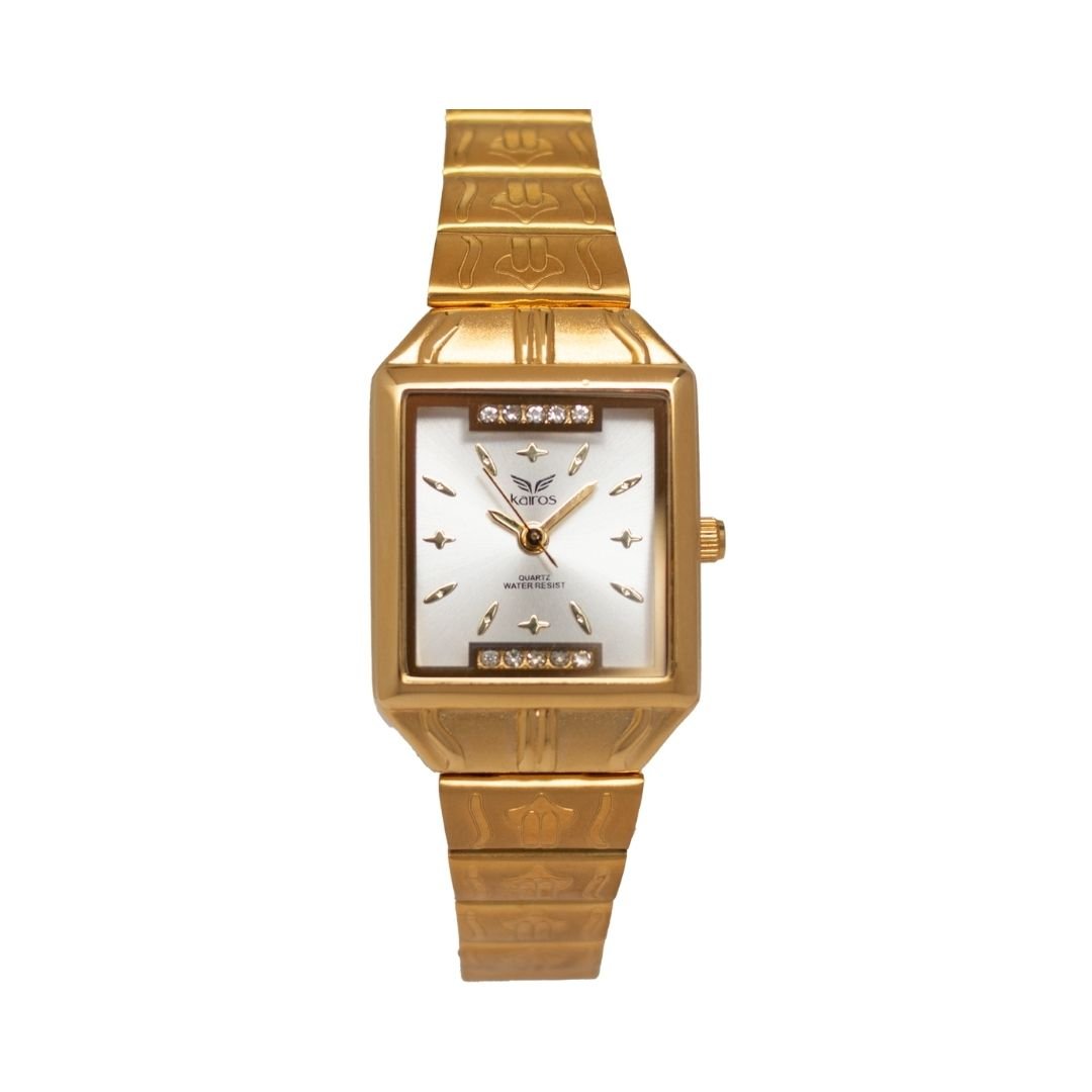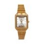 Reloj de acero inoxidable en acabado dorado, con tablero cuadrado fondo blanco que aporta un toque distintivo y sofisticado. Incorpora hora puntera y calendario integrado. Ofrece resistencia al agua de 3 ATM, apto para salpicaduras pero no sumergible, y cuenta con un brazalete dorado , ajustable y cómodo, perfecto para uso diario o formal